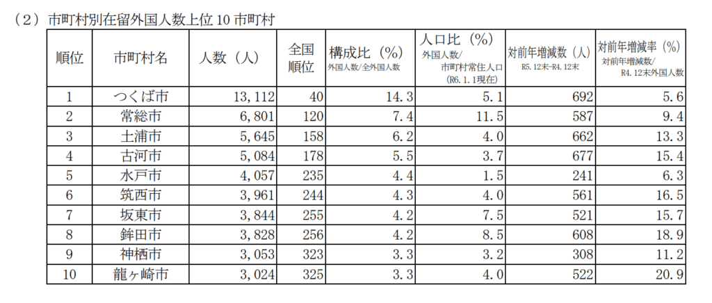 一方で、常総市や筑西市では、製造業が盛んな地域であることが影響し、外国人労働者が急増しています。特に、常総市は人口に対する外国人の比率が非常に高く、11.5%に達しています。