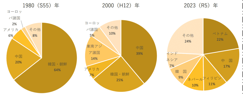 - 1980年代:韓国・朝鮮が圧倒的な比率を占め、単一的な外国人構成が特徴的でした。