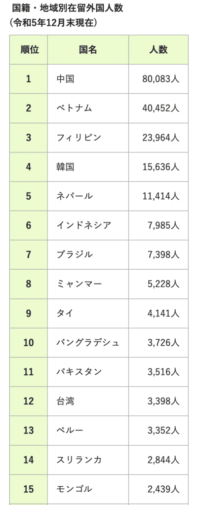 埼玉県に在留する外国人の多くはアジア諸国出身であり、その中でも中国(80,083人)、ベトナム(40,452人)、フィリピン(23,964人)からの移住者が特に多くを占めています。特にベトナム出身者の増加が目立ち、技能実習生や留学生を中心に数が急増しています。また、南米からの移住者も一定数存在し、ブラジルやペルーからのコミュニティも根強いです。