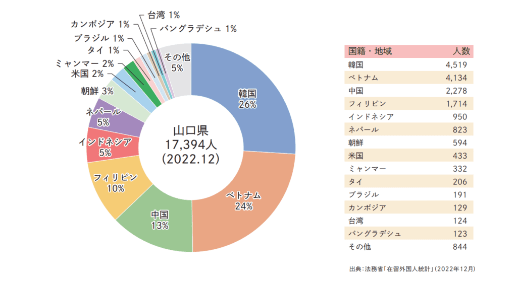 2022年12月末時点で、山口県の在留外国人数は17,394人に達しています。この数字は県内の多様な産業において外国人労働者の重要性が高まっていることを示しています。特に注目すべきは、韓国(26%)とベトナム(24%)出身の在留者が全体の約半数を占めていることです。これは、山口県の歴史的背景地理的要因が影響している可能性があります。