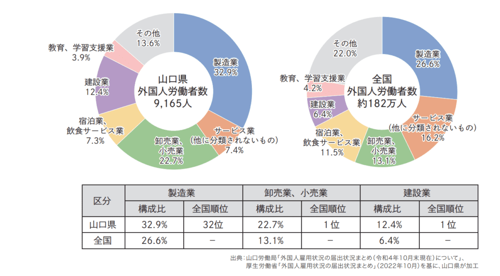 特に、卸売業・小売業建設業において、山口県の外国人労働者の比率が全国1位である点が注目されます。製造業の割合は全国平均(26.6%)を上回っており、山口県では外国人がさまざまな業種で重要な役割を果たしています。特に、卸売業・小売業建設業では、外国人労働者の活躍が不可欠です。